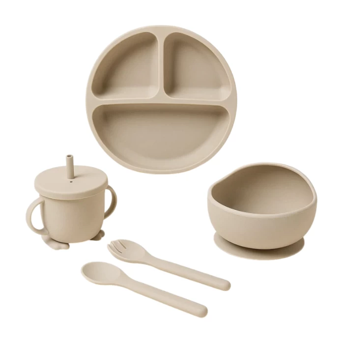 Հավաքածուն պատրաստված է սիլիկոնից, ներառում է՝ ապուրաման, գոգնոց կերակրման, գդալ, պատառաքաղ և ափսե։