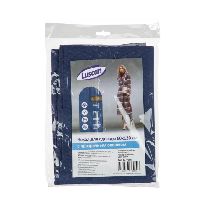 Luscan ապրանքանիշի հագուստի պարկ պատուհանով։ Օպտիմալ ընտրություն կոստյումներ, զգեստներ, վերնազգեստներ և զգեստապահարանի այլ իրեր պահելու կամ տեղափոխելու համար։ Ապրանքը չի կեղտոտվի, պաշտպանված կլինի խոնավությունից և փոշուց և կպահպանի ներկայանալի տեսք: Ծածկույթը պատրաստված է շնչող ոչ հյուսված նյութից, իսկ օգտագործման հարմարավետության համար պատուհանաձեւ ներդիրը՝ դիմացկուն պոլիէթիլենից։ Կապույտ գույնը կանխում է ուլտրամանուշակագույն ճառագայթների ներթափանցումը, որը կարող է առաջացնել ապրանքի դեղնացում։ Պարկերն այնպես են կարված, որ թույլ են տալիս պահել նաև մեծածավալ արտաքին իրեր (մուշտակներ, վերարկուներ, բաճկոններ և այլն): Պարկի չափսը՝ 60120 սմ։